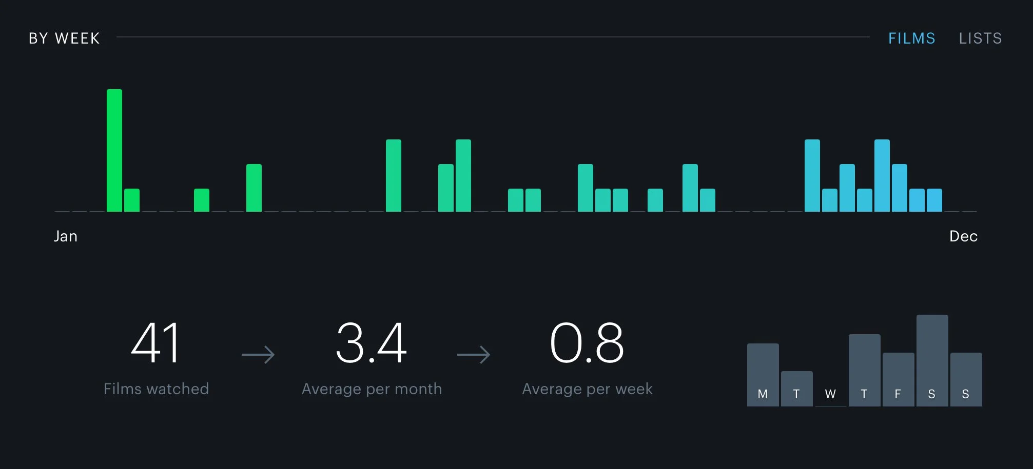 I’ve been having a lot of fun recording my movie watching with Letterboxd this year. In my first year on the platform, I’ve watched 41 movies - a little less than one per week. Although, that doesn’t count all the Marvel movies I’m constantly rewatching.