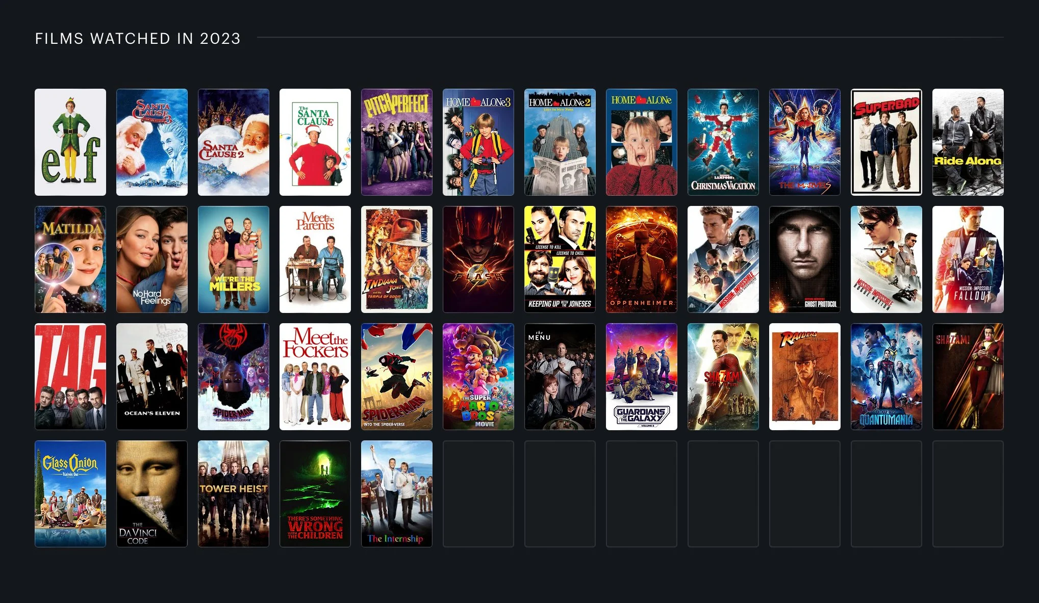 At the end of 2023, I’ve watched 5% of the Letterboxd Top 250 movies, 10% of the IMDb Top 250, and 38% of the Box Office Mojo All Time 100. Maybe I should get interested in some more prestigious films next year so that I can keep up with The Big Picture. I could start working on the Oscar Best Picture Winners, of which I’ve only watched 3%.