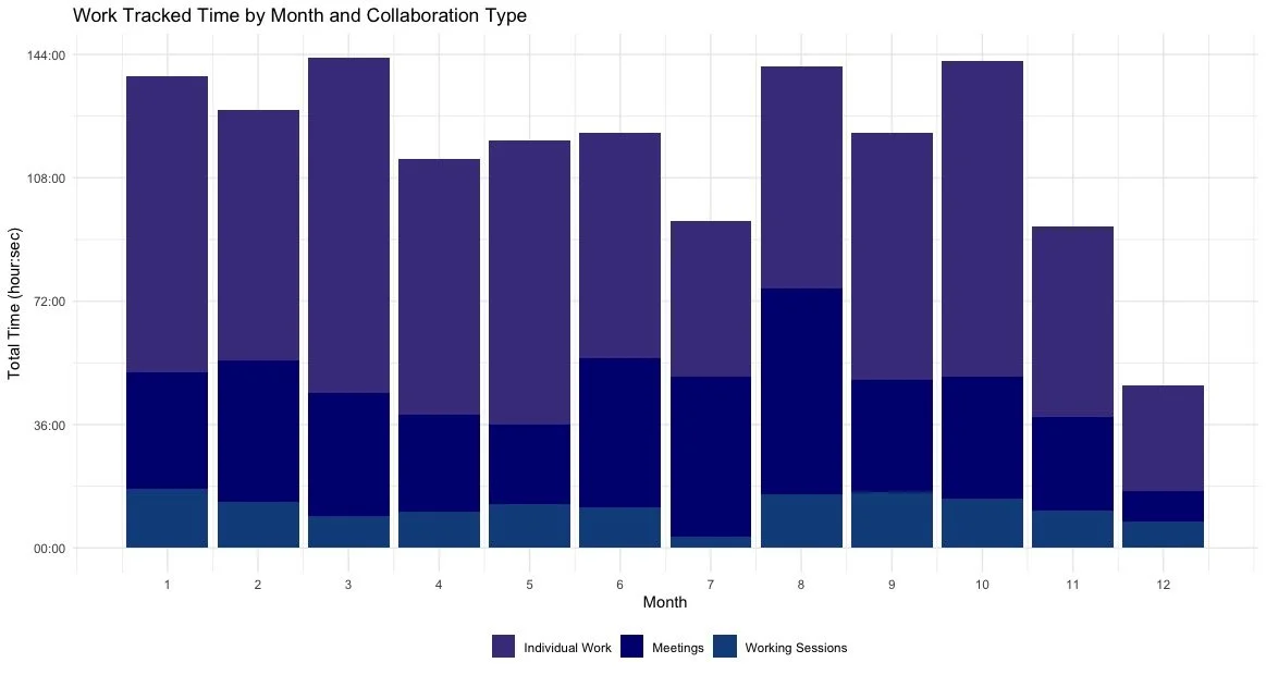 With all these open projects, my team and I are consistently struggling with the “right” amount of time to spend collaborating and working individually. This year, I spent 30% of my time in meetings and 10% in working sessions, leaving 60% of my focused time for individual work. This was fairly consistent throughout the year, but August brought significantly more meetings and working sessions as I took on collaboration opportunities and core work increased for several projects simultaneously.