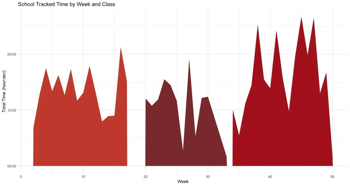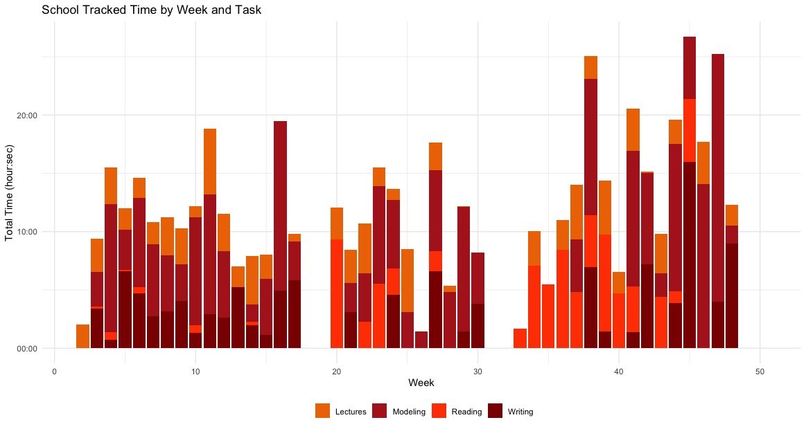 This has been a very interesting experiment, and I plan to do it again next year. Much of the value I get from tracking my time isn’t even in this bulky review. I have a much better understanding of when I burn out, not just over a semester but day-to-day. Some days it’s tempting to put in a twelve-hour day just to inflate the numbers or to feel accomplished in some weird way. But it doesn’t work out in the end because the next day I inevitably log much less focused time. In this way, I’ve learned valuable information about how to structure my school work to best fit into other parts of my life.