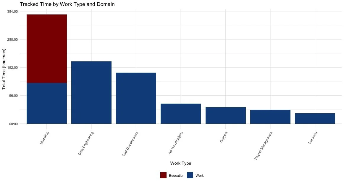 The type of work I did shifted over the year. The beginning of the calendar year and the end of the fiscal year involved more tool development time, mostly related to a major redesign of one of our internal web apps in January and the subsequent feature additions. Data engineering work was highest through the spring and into the summer, mostly driven by required testing and debugging of new Databricks Long-Term Support versions in our AMI data pipeline and the design of a new database for energy efficiency program evaluation data. The increase in fall modeling work resulted from a strong push to clean up existing measure-level EE and BE load shapes as well as the ad hoc analysis around CWHPs.
