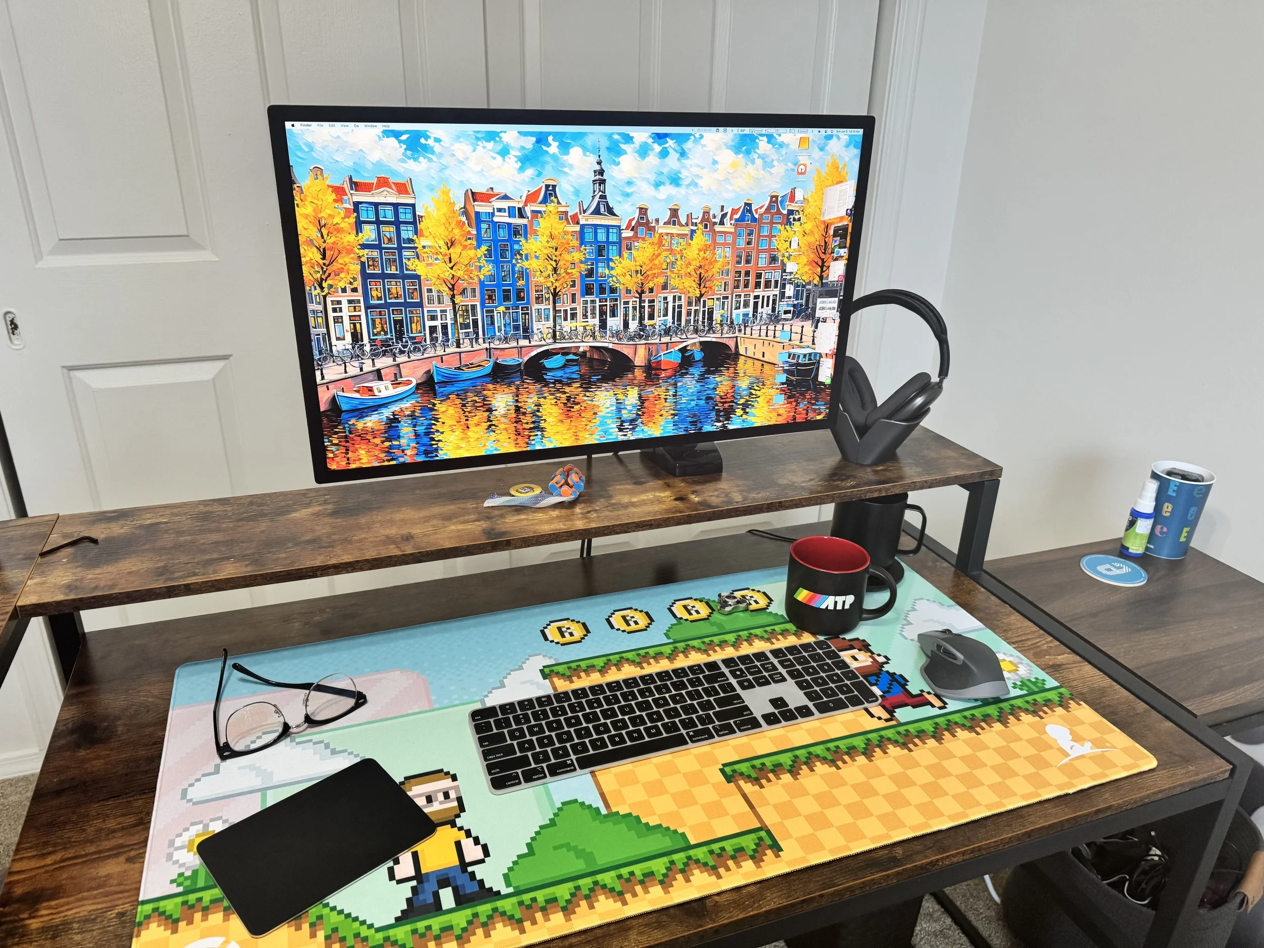 For my personal/school setup, I’ve been much more intentional (and sunk much more cash into it). I have a Mac Studio with 64 GB of RAM, 2 TB of storage, and an M1 Max chip. This has so far been more than enough for my needs in grad school. The main landscape monitor is an Apple Studio Display, I’ve relocated my HP 24f, which was gifted to me long ago, to my desk at a local coworking space (not pictured). To round out the Apple gear, I have a Magic Keyboard, a Magic Trackpad, a pair of AirPods Max, and a HomePod. I use the AirPods Max when I need to focus and the HomePod Mini for background music and podcasts. I primarily use a second Logitech MX Master mouse, but have recently added the trackpad for gestures.
